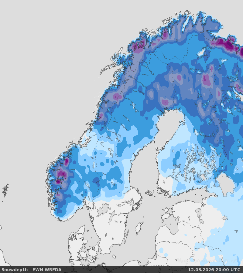- Snökartan nedan visar snötäcket de kommande dygnen och uppdateras 3 gånger per dygn. Bredvid vatten blir informationen kantig på grund av kartans noggrannhet som uppgår till 0,5°.